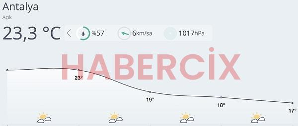 Yapılan son tahminlere göre, kentte hafta boyu sıcak bir hava olması bekleniyor. Değerlendirmelere göre yağış beklenmezken Cuma günü sıcaklık 25 dereceye çıkacak. Antalya’da nem oranı ise %57.