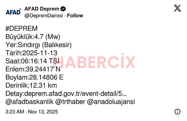 AFAD’ın ölçümlerine nazaran, 13 Kasım’da Balıkesir Sındırgı’da saat 06.16’da 4.7, saat 06.20 ve saat 06.21’de 4.2 büyüklüğünde 3 zelzele meydana geldi. Birbirini takip eden zelzeleler vatandaşların endişe yaşamasına neden olurken ilerleyen saatlerde yaşanan zelzeleler 3 küsur civarında seyretti.