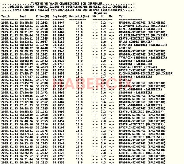 Kandilli Rasathanesi Son Zelzeleler Listesi
