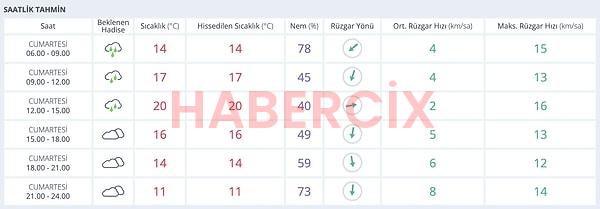Öte yandan kentte gün içerisinde hava sıcaklıklarında 4 ila 6 derece düşüş öngörülüyor. En yüksek sıcaklık 20 derece olurken; gece saatlerinde kimi bölgelerde hava sıcaklığı 11 derecelere kadar düşebilir.