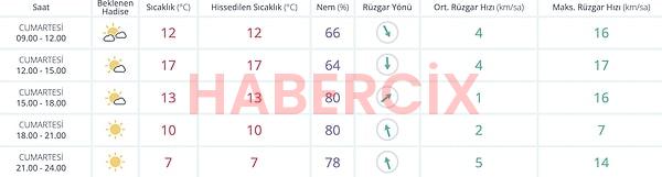 Sabah saatlerinde sıcaklık 12 derece düzeyinde olacak. Kesimli bulutlu havayla birlikte nem oranı yüzde 66 olarak ölçülüyor. Rüzgarın 4 km/sa süratle esmesi nedeniyle hava çok sert hissedilmeyecek. Öğlene hakikat sıcaklık besbelli formda artıyor ve 17 dereceye yükseliyor. Tıpkı saatlerde nem oranının yüzde 64’e gerilediği görülüyor.