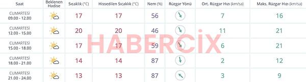Sabah saatlerinde sıcaklık 17 derece civarında seyredecek. Nem oranı yüzde 56 olurken rüzgarın 7 km/sa süratle estiği görülüyor. Öğlen saatlerinde ise havanın biraz daha ısınacağı ve sıcaklığın 20 dereceye ulaşacağı iddia ediliyor. Bu saatlerde nem oranı yüzde 46’ya kadar düşüyor.