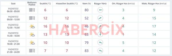 Saat 06.00-12.00 ortası puslu olan gökyüzü 12.00’dan itibaren yerini güneşe bırakacak. Saat 15.00’a kadar 16 derecede seyreden hava sıcaklığı kademeli olarak düşecek. En düşük sıcaklık ise saat 21.00-24.00 ortası olacak. Bu saatler ortasında hava sıcaklığı 7 dereceye kadar düşecek.