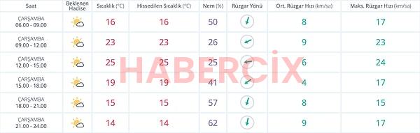 Günün en yüksek sıcaklığı 25°C, en düşük sıcaklığı ise 14°C civarında seyredecek. Sabah saatlerinde hafif serin ve 16 derece civarında başlayan hava, öğlene yanlışsız ısınacak ve yazı hatırlatan 25 derecelere çıkacak. Gün genelinde gökyüzü çoğunlukla parçalı bulutlu, güneş vakit zaman kendini göstermeye devam edecek. Öğlenden sonra sıcaklıklar yavaş yavaş düşerken, akşam ve gece saatlerinde serinlik hissedilecek.