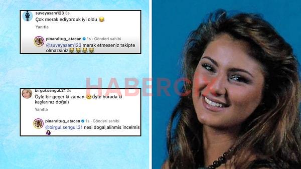 Bir takipçisinin ‘İşte buradaki kaşlarınız doğal’ yorumuna “Nesi doğal, alınmış incelmiş!” şeklinde yanıt verdi. Başka bir kullanıcının ‘Çok merak ediyorduk, iyi oldu’ tepkisine ise ‘Merak etmeseniz takipte olmazsınız.’ ifadeleriyle karşılık verdi.
