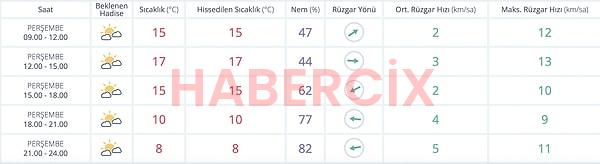 Saat 06.00-12.00 ortası sıcaklık 15 derece olacak. 12.00’dan itibaren sıcaklık 17 dereceye ulaşacak. Saat 15.00’a kadar 17 derecede seyreden hava sıcaklığı kademeli olarak düşecek. En düşük sıcaklık ise saat 21.00-24.00 ortası olacak. Bu saatler ortasında hava sıcaklığı 8 dereceye kadar düşecek.