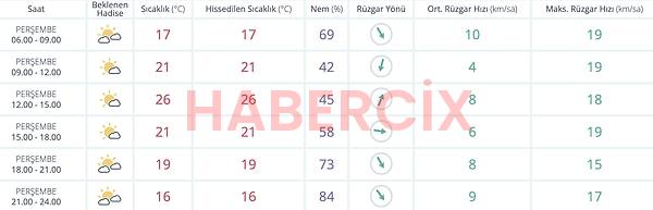 Günün ilerleyen saatlerinde sıcaklık kademeli olarak azalıyor. 18.00 – 21.00 ortasında sıcaklık 19 dereceye inecek ve nem yüzde 73’e çıkacak. Akşam rüzgâr suratının ise 15 km/sa düzeylerinde olması bekleniyor.