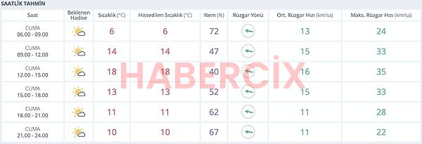Sabah erken saatlerde 6 derece ile başlayacak sıcaklık, öğlen saatlerinde en yüksek 18 dereceye ulaşacak. Öğlenden sonra sıcaklık düşüşe geçerek akşam 10 derece civarında olacak. Nem oranı sabah %72 iken, öğlen saatlerinde %40’a kadar düşecek ve akşam tekrar yükselecek. Rüzgar gün boyunca Kuzeybatı istikametinden esecek ve en kuvvetli rüzgar suratı öğlen saatlerinde 35 km/sa olarak varsayım ediliyor. Genel olarak ılık ve rüzgarlı bir gün bekleniyor.