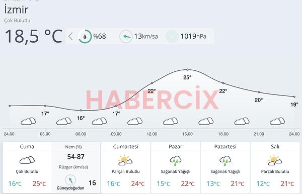 Nem oranı %68 olarak ölçülürken hafta sonu Ege kentinde yağış bekleniyor. Hafta uzunluğu sıcaklıkların 21 ila 24 derece ortası seyretmesi öngörülüyor. Havanın iki gün boyunca kesimli bulutlu olması bekleniyor.