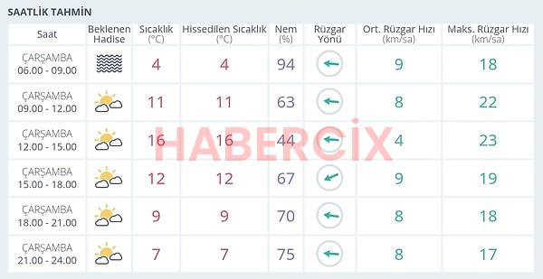 Sabah 06:00-09:00 saatleri ortası ağır nemli (94%) ve muhtemelen sisli başlayacak. Öğlen saatlerine gerçek (09:00-15:00) hava güneşli ve modüllü bulutlu olacak, sıcaklık 16°C’ye kadar çıkacak. Rüzgar gün uzunluğu çoklukla batı tarafından esecek. En yüksek rüzgar suratı öğlen civarı (12:00-15:00) 23 km/sa bekleniyor. Akşam saatlerinde sıcaklıklar 7°C’ye düşerken, nem oranı tekrar yükselerek %75’i bulacak.