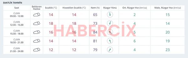 Saatlik kestirimlere nazaran sabah saat 09.00 ile 12.00 ortasında sıcaklık 14 derece düzeylerinde seyredecek. Hissedilen sıcaklığın da birebir düzeyde olması beklenirken nem oranı yüzde 65 civarında olacak. Öğlen saatlerine yanlışsız ise sıcaklık artarak 18 dereceye kadar yükselecek. Bilhassa 12.00 – 15.00 saatleri ortasında günün en sıcak vakit dilimi yaşanacak.