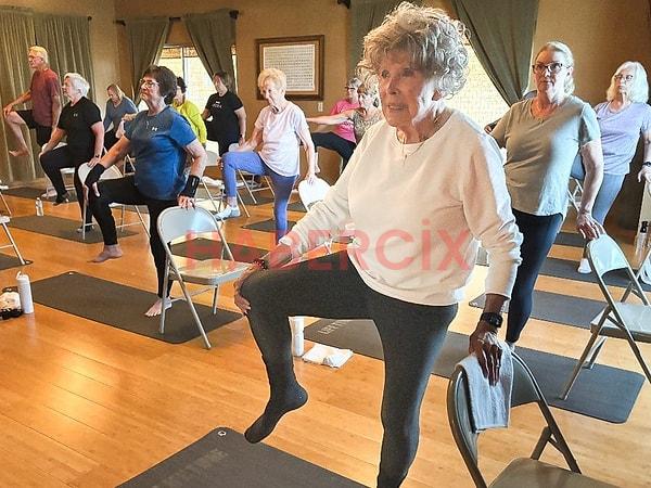 Önce yoga yapıyor, ardından dans ağırlıklı bir grup dersine katılıyor. “Sınıftaki en yaşlı kişi benim ama en önde durmayı seviyorum” diye anlatıyor. Spor salonu dışında iki köpeğiyle her gün yürüyüş yapmayı da aksatmıyor.