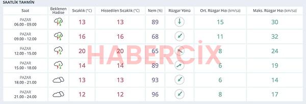 09.00-12.00 aralığında yağış tesirini biraz daha artırıyor. Sıcaklık 16 dereceye kadar yükselirken hissedilen sıcaklık da tıpkı düzeyde. Günün en ağır yağışının yaşandığı saat dilimi ise 12.00-15.00 ortası. Termometreler 20 dereceyi gösteriyor lakin yağmur kuvvetleniyor. 15.00-18.00 saatlerinde yağış tesirini kaybetmeye başlıyor ve hava yine bulutlanıyor. Akşam 18.00’den sonra yağmur büsbütün duruyor. 18.00-21.00 ortasında 13 derece olan hava sıcaklığı, yüksek nemle birlikte serin lakin yağışsız bir akşam yaşatıyor. Gece 21.00-24.00 ortasında sıcaklık 12 dereceye düşerken bulutlu hava günün kapanışını yapıyor.