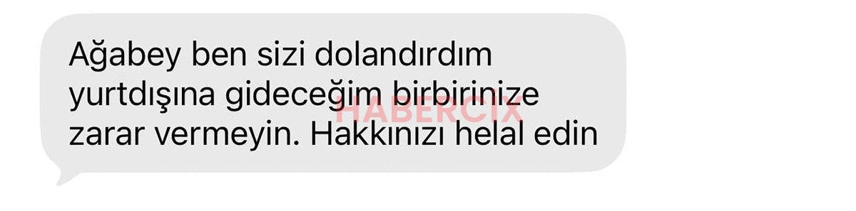 Bu sırada kuşkulu, M.T.’nin cep telefonuna, “Ağabey ben sizi dolandırdım. Yurt dışına gideceğim. Birbirinize ziyan vermeyin. Hakkınızı helal edin” formunda bildiri gönderdi.
