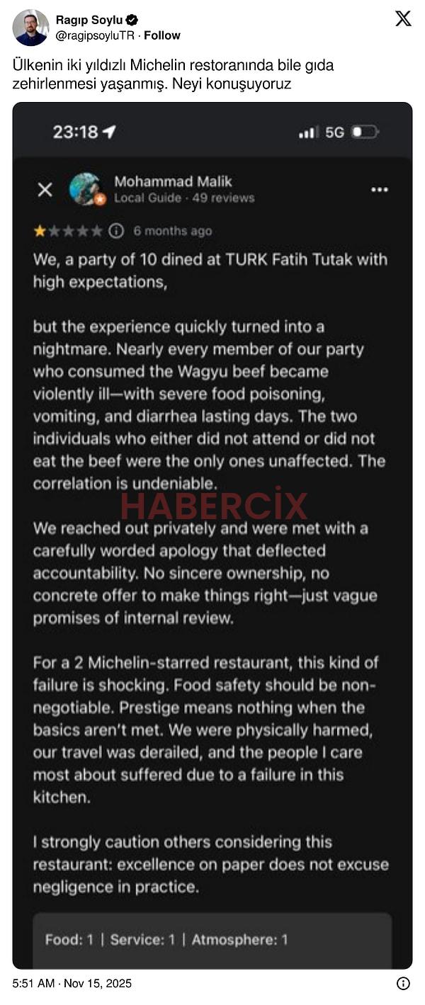 İstanbul Fatih’te yaşanan Böcek ailesinden 3 kişinin hayatını kaybettiği zehirlenme olayı konuşulurken, iki Michelin yıldızlı bir restoranda da bir turist grubunun zehirlendiği iddiası gündeme oturdu. İddiaya göre, 10 kişilik bir turist grubu, dünyaca ünlü şefin restoranına gitti. Gruptan sekiz kişi restoranda zehirlendiklerini öne sürdü.