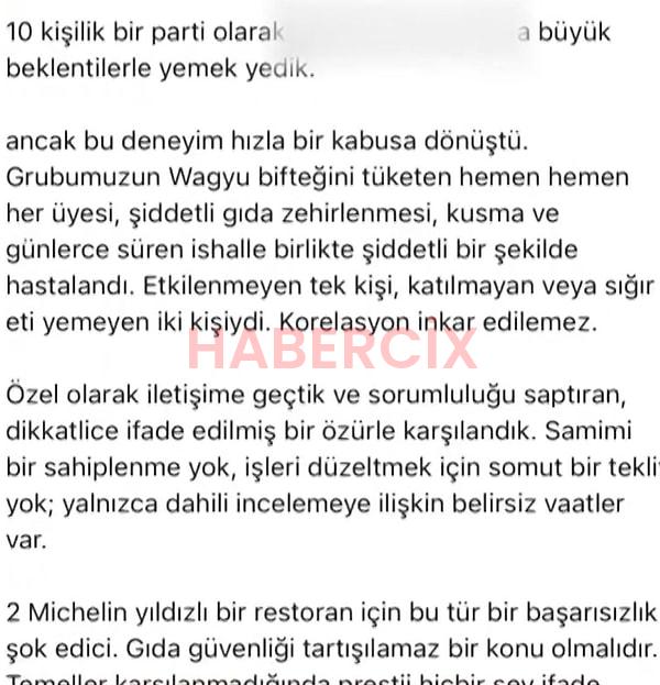İddiaya göre 10 kişilik turist grubu, restoranda yediği wagyu etinden zehirlendi. Mide rahatsızlığı yaşayan 8 kişi, sağlık problemleriyle karşılaştı ancak restoran ile iletişime geçmelerine rağmen muhatap bulamadılar. Çareyi restorana yorum yapmakta buldular.