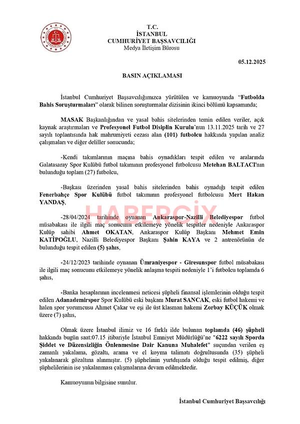 İstanbul Cumhuriyet Başsavcılığı, bahis soruşturması kapsamında açıklama yaptı. Yapılan açıklamada gözaltına alınan isimler arasında Fenerbahçeli Mert Hakan Yandaş, Galatasaraylı Metehan Baltacı, yorumcu Ahmet Çakar ve eşi ile hakem Zorbay Küçük gibi isimler olduğu belirtildi.