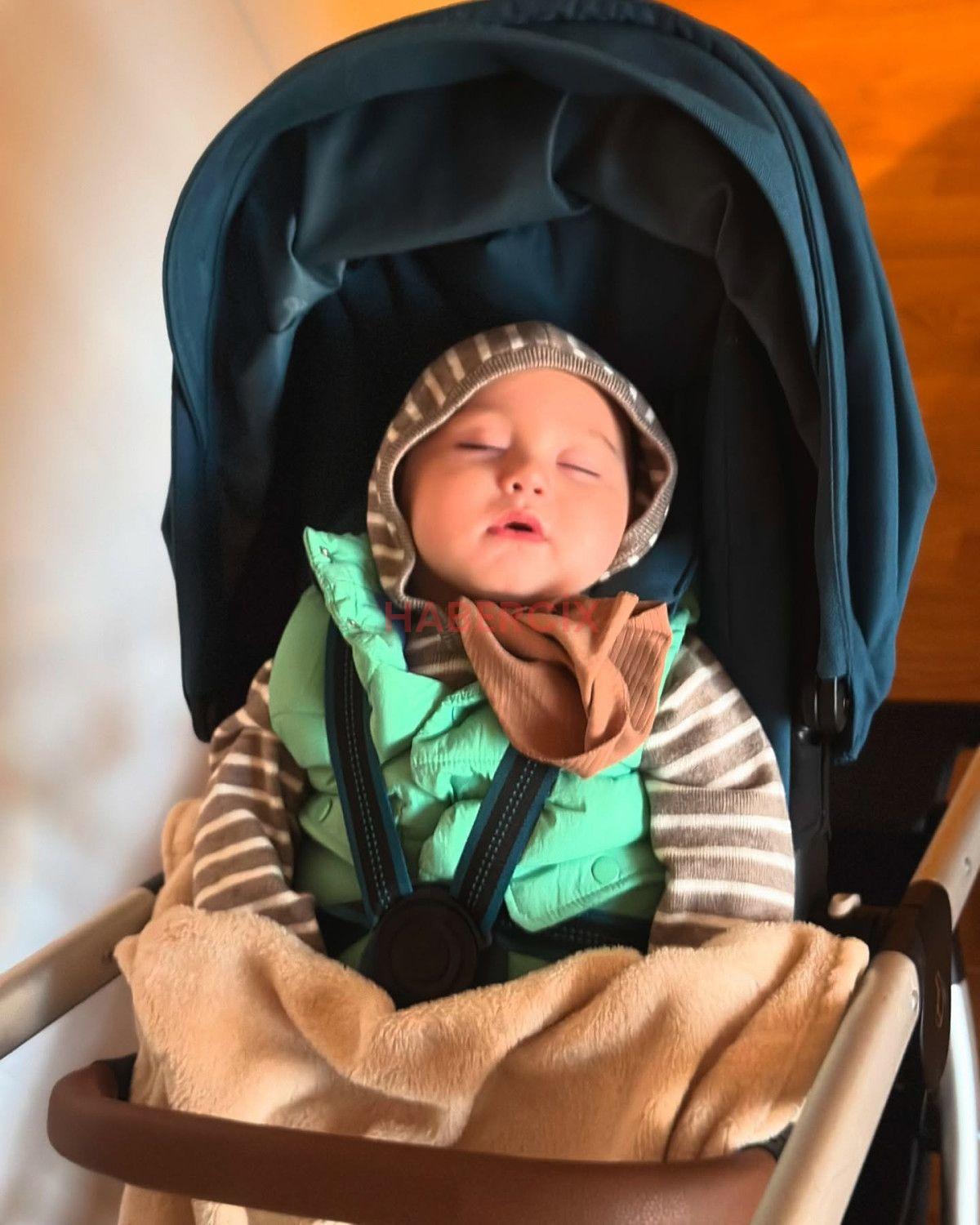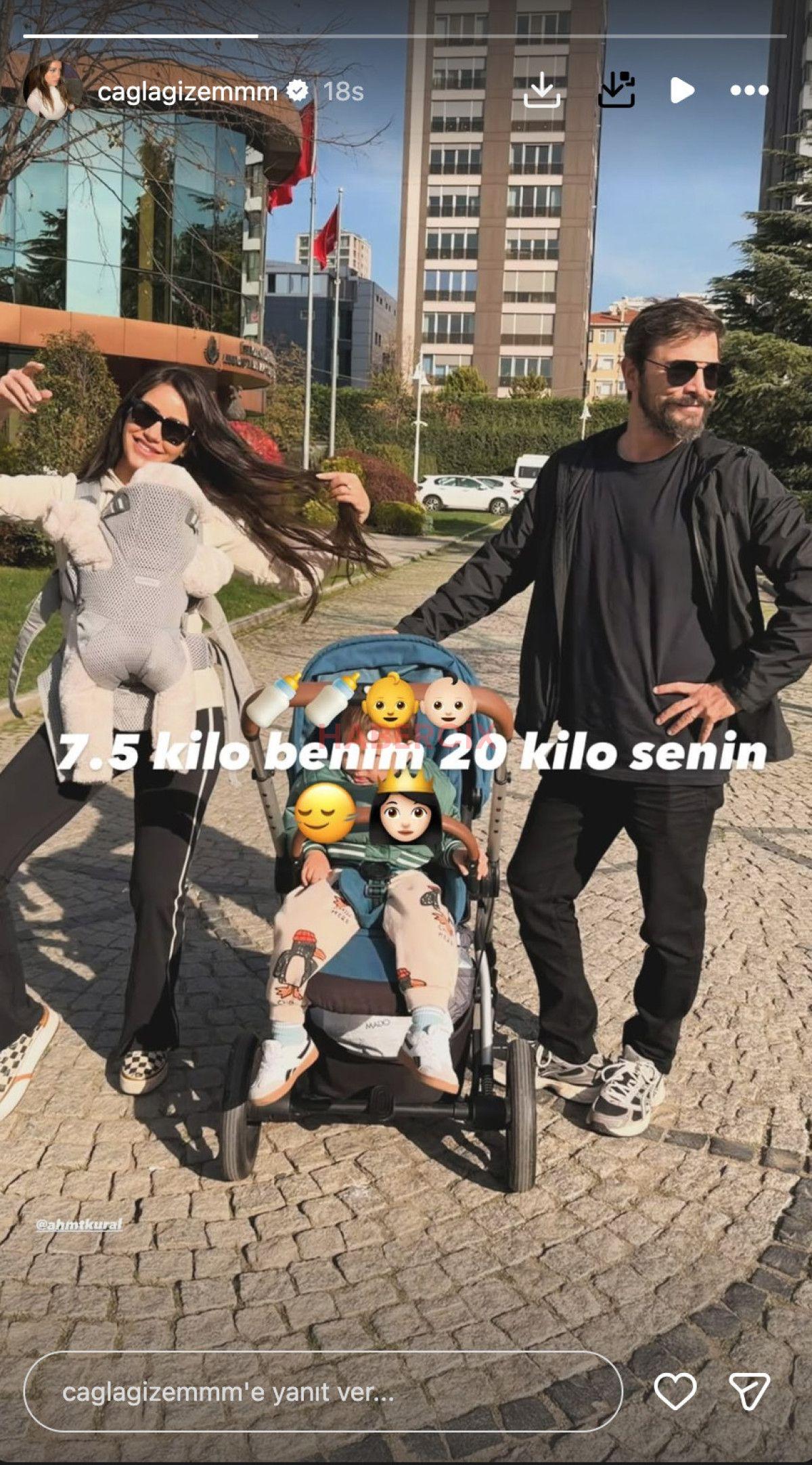 Mutlu aile pozlarını paylaşan ünlü çift eğlenceli karenin altına, “7 buçuk kilo benim, 20 kilo senin” notunu ekledi.