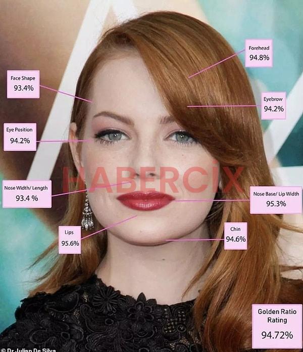 Güzel oyuncu, kaş oranında %94,2, çene hattında %97 ve dudak ölçülerinde %95,6 puanla birinci oldu. Londra’daki Centre For Advanced Facial Cosmetic and Plastic Surgery kliniğinin yöneticisi Dr. Julian De Silva, “Emma Stone, yüzün tüm bölümleri fiziksel mükemmellik açısından ölçüldüğünde açık ara kazanan oldu” ifadelerini kullandı. Silva, “Tüm oranlarda gösterdiği istikrarlı mükemmellik onu listenin başına taşıdı,” diye de ekledi.