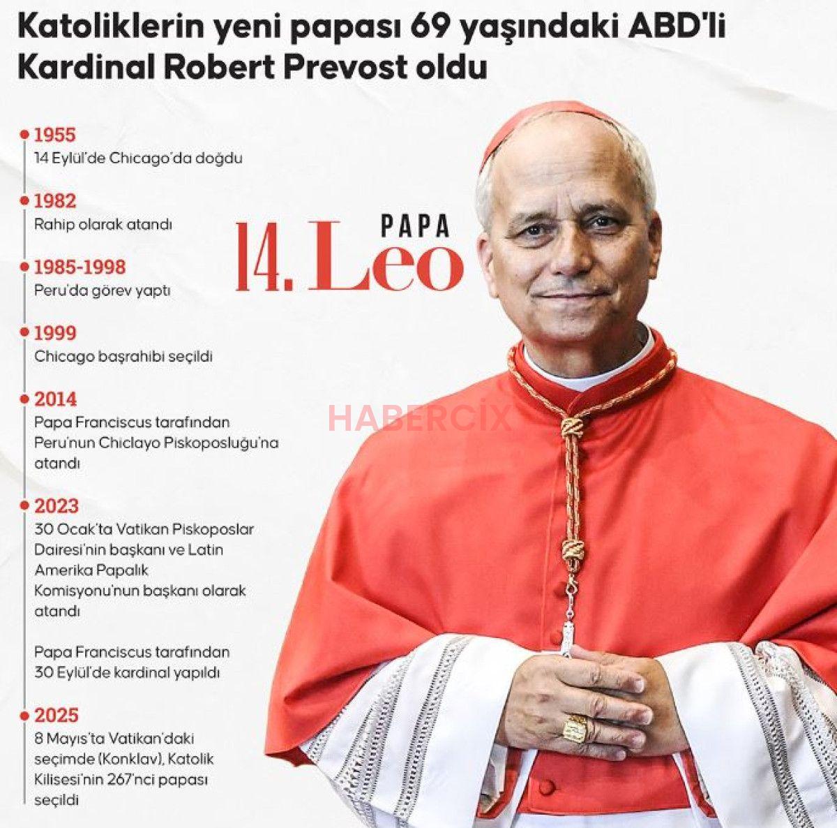 Peru’da uzun yıllar görev yapan ve Peru vatandaşlığı da bulunan Prevost, 1982’de rahip olarak atandı ve 30 Eylül 2023’te selefi Papa Franciscus tarafından Kardinal yapıldı.