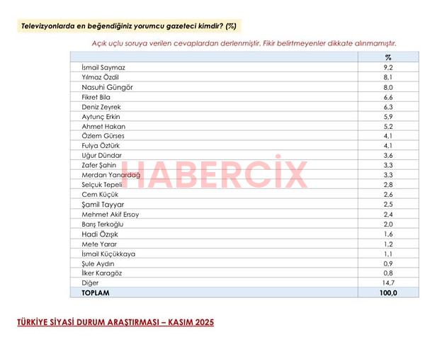 Sosyal medyayla birlikte gündem hakkında yorum veya analiz yapan kişiler çoğalsa da televizyon kanalları bu alanda hala çok güçlü. Özellikle haber kanallarıyla ekrana gelen yorumcular ülkedeki gündemin büyük çoğunluğunu belirliyor, haberleri ve ortaya attıkları iddialarla sektörlerine yön veriyor. TV yorumcularının bu kadar etkili olmasından ötürü Area Araştırma açık uçlu bir şekilde en çok beğenilen TV yorumcularını vatandaşa sordu. Birinci olan İsmail Saymaz, X hesabı üzerinden izleyenlere teşekkür etti.