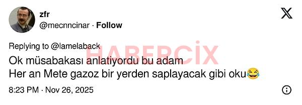 ‘Ok karşılaşması anlatıyordu bu adam. Her an Mete Gazoz bir yerden saplayacak üzere oku.‘