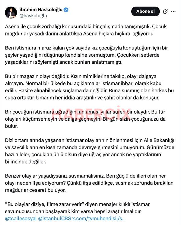 Paylaşımında özellikle ‘normal bir ülkede bu açıklamaların istismar ihbarı’ olarak kabul edilmesi gerektiğini, “basite alınabilecek bir suçlama olmadığını” vurguladı. Haskoloğlu, Aile ve Sosyal Politikalar Bakanlığı ile savcılıkların en kısa sürede devreye girmesini, dizi/film setlerinde yaşanan istismar iddialarının sistematik olarak incelenmesi gerektiğini söyledi.