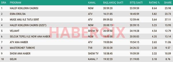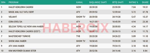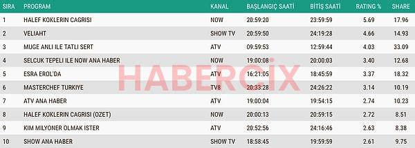 Total sıralamaya dönecek olursak Esra Erol 2. sırada, Müge Anlı da 3. sırada yer aldı. Peşlerinden ise Halef’in özeti geldi. Veliaht Total sıralamasında 5. oldu.