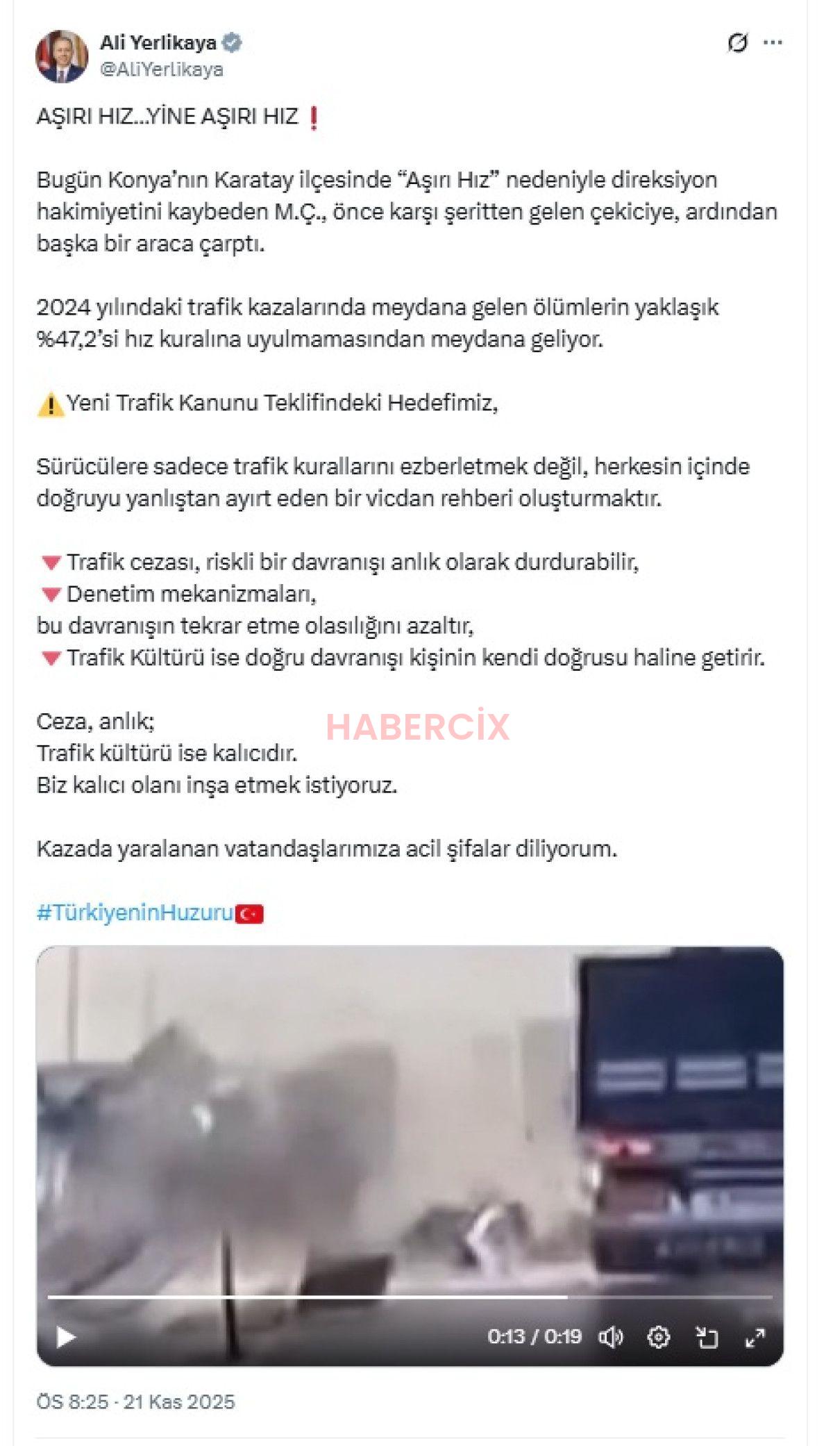 “Bugün Konya’nın Karatay ilçesinde ‘aşırı hız’ nedeniyle direksiyon hakimiyetini kaybeden M.Ç., evvel karşı şeritten gelen çekiciye, akabinde öbür bir araca çarptı. 2024 yılındaki trafik kazalarında meydana gelen ölümlerin yaklaşık yüzde 47,2’si sürat kuralına uyulmamasından meydana geliyor. Yeni Trafik Kanunu Teklifindeki maksadımız, şoförlere yalnızca trafik kurallarını ezberletmek değil, herkesin içinde doğruyu yanlıştan ayırt eden bir vicdan rehberi oluşturmaktır. Trafik cezası, riskli bir davranışı anlık olarak durdurabilir, kontrol düzenekleri, bu davranışın tekrar etme mümkünlüğünü azaltır, trafik kültürü ise gerçek davranışı kişinin kendi doğrusu haline getirir. Ceza, anlık; trafik kültürü ise kalıcıdır. Biz kalıcı olanı inşa etmek istiyoruz. Kazada yaralanan vatandaşlarımıza acil şifalar diliyorum”