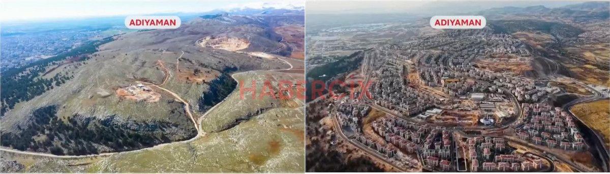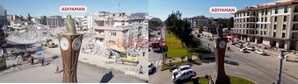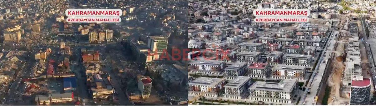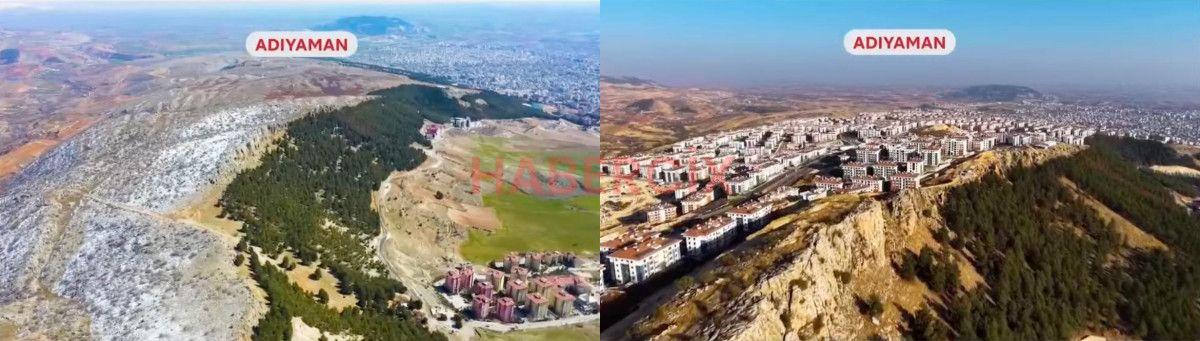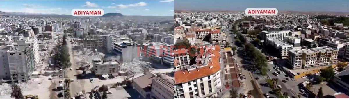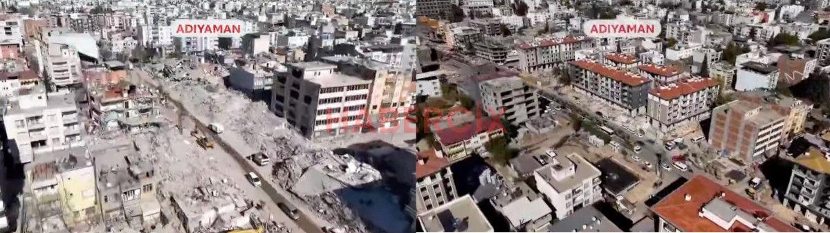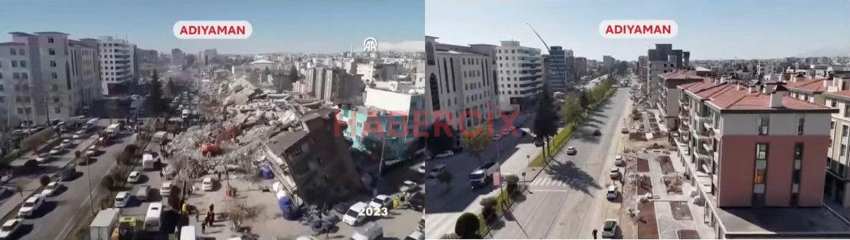 Öte yandan Cumhurbaşkanı Erdoğan, konuşurken deprem bölgesinde asrın felaketinden bu yana yaşanan değişimin görüntüleri ekrana geldi.