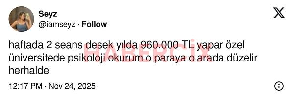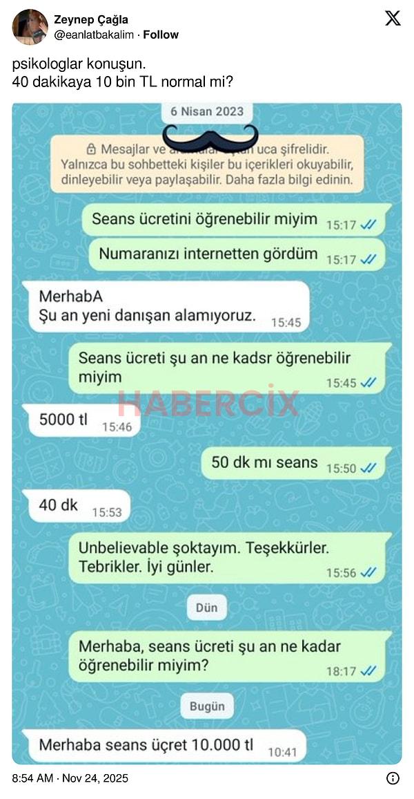 Son zamanlarda psikologlara olan talep arttı. Talebin artmasıyla danışma ücretlerinin artması da desteğe ihtiyaç duyan pek çok kişinin ortak şikayeti haline geldi. Durum öyle bir hale geldi ki bir seans için günlerce çalışmanız gerekebiliyor. Bir X kullanıcısı da internetten gördüğü bir psikoloğa seans ücretini sordu. Şaşkınlığını gizleyemeyen kullanıcının verdiği tepki olay oldu.