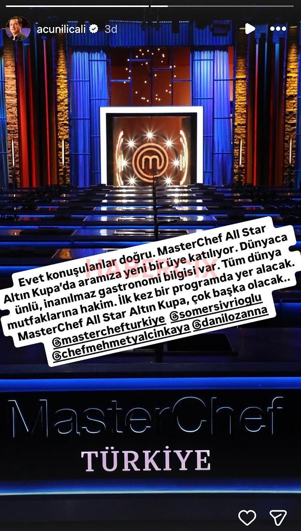 Acun Ilıcalı paylaşımında “Evet konuşulanlar doğru. MasterChef All Star Altın Kupa’da aramıza yeni bir üye katılıyor. Dünyaca ünlü, inanılmaz gastronomi bilgisi var. Tüm dünya mutfaklarına hakim. İlk kez bir programda yer alacak. MasterChef All Star Altın Kupa, çok başka olacak…’ ifadelerini kullandı.