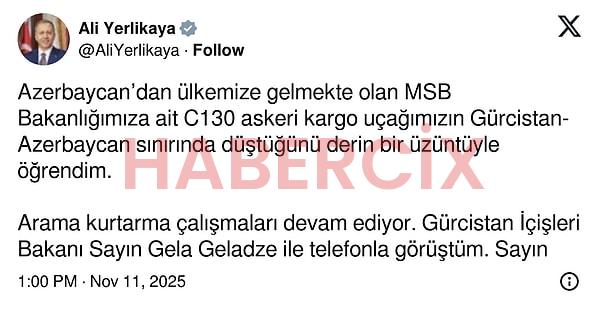 ‘Azerbaycan’dan ülkemize gelmekte olan MSB Bakanlığımıza ait C130 askeri kargo uçağımızın Gürcistan-Azerbaycan sınırında düştüğünü derin bir üzüntüyle öğrendim.