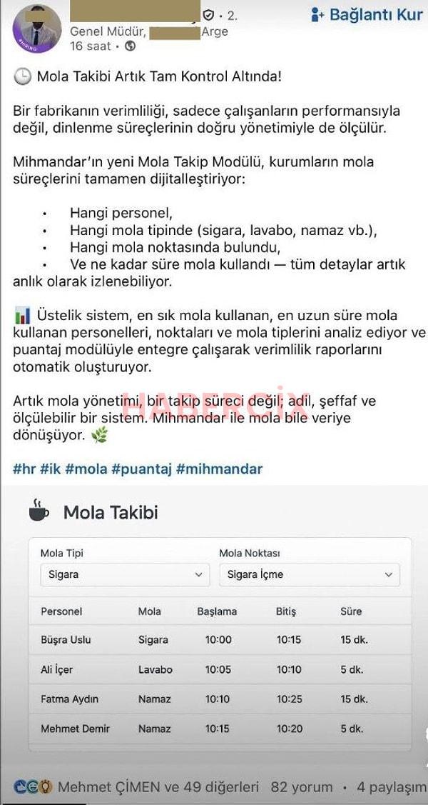 Linkedin’de paylaşılan bir gönderi sosyal medyada gündem oldu. Firmalara “İnsan Kaynakları” platformu düzenleyen bir firmanın ürettiği yazılımla, çalışanların ne kadar süre mola kullandı, molada neler yaptığı kontrol altına alınabiliyor. Linkedin’de paylaştığı gönderi ile ürünün reklamını yapan genel müdür ise sonrasında gönderisini sildi.