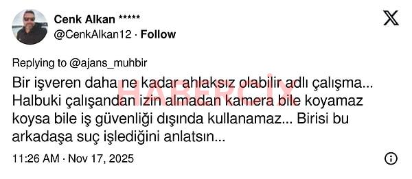 ‘Bir işveren daha ne kadar ahlaksız olabilir adlı çalışma… Halbuki çalışandan izin almadan kamera bile koyamaz koysa bile iş güvenliği dışında kullanamaz… Birisi bu arkadaşa suç işlediğini anlatsın…‘