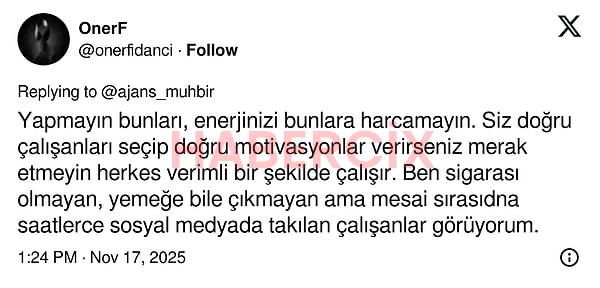 ‘Yapmayın bunları, enerjinizi bunlara harcamayın. Siz doğru çalışanları seçip doğru motivasyonlar verirseniz merak etmeyin herkes verimli bir şekilde çalışır. Ben sigarası olmayan, yemeğe bile çıkmayan ama mesai sırasında saatlerce sosyal medyada takılan çalışanlar görüyorum.‘