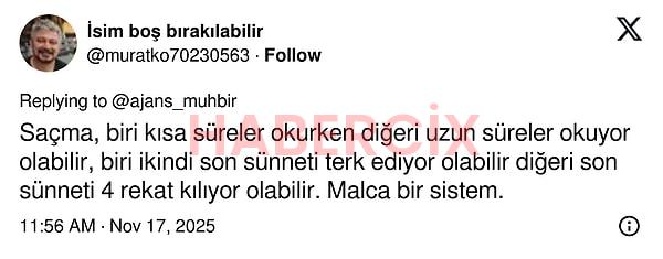 ‘Saçma, biri kısa süreler okurken diğeri uzun süreler okuyor olabilir, biri ikindi son sünneti terk ediyor olabilir diğeri son sünneti 4 rekat kılıyor olabilir. Malca bir sistem.‘