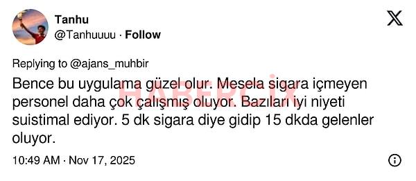 ‘Bence bu uygulama güzel olur. Mesela sigara içmeyen personel daha çok çalışmış oluyor. Bazıları iyi niyeti suistimal ediyor. 5 dk sigara diye gidip 15 dkda gelenler oluyor.‘