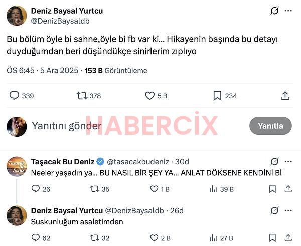 Taşacak Bu Deniz’in Esme’si Deniz Baysal, X paylaşımında “Bu bölüm öyle bir sahne, öyle bir flashback var ki… Hikayenin başında bu detayı duyduğumdan beri düşündükçe sinirlerim zıplıyor.” ifadeleri kullanırken dizinin resmi sosyal medya hesabından yanıt gecikmedi.
