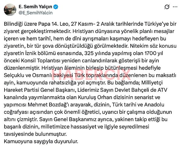 MHP Genel Başkan Yardımcısı Semih Yalçın, Papa 14. Leo’nun Türkiye ve özellikle İznik ziyaretine tepki gösteren yazılı bir açıklama yayımladı. Bu metnin sonunda konu, ATV’de yayımlanan Kuruluş Orhan dizisine geldi ve Devlet Bahçeli’nin övgü dolu sözleri dikkat çekti.