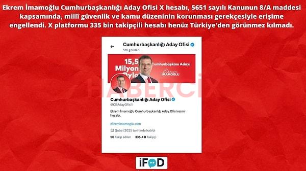 İfade Özgürlüğü Derneği, Ekrem İmamoğlu Cumhurbaşkanlığı Aday Ofisi’nin “X”teki eski ve yeni hesaplarının 5651 sayılı Kanunun 8/A maddesi uyarınca “millî güvenlik ve kamu düzeni” gerekçesiyle peş peşe erişime engellendiğini açıkladı.