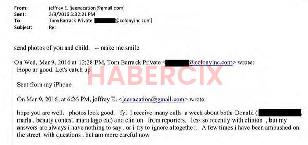 Epstein ile Barrack’ın 9 Mart 2016 yılında mail üzerinden haberleştiği ve Epstein’ın, “Çocukla fotoğrafını gönder, beni gülümset.’ yazdığı görüldü.