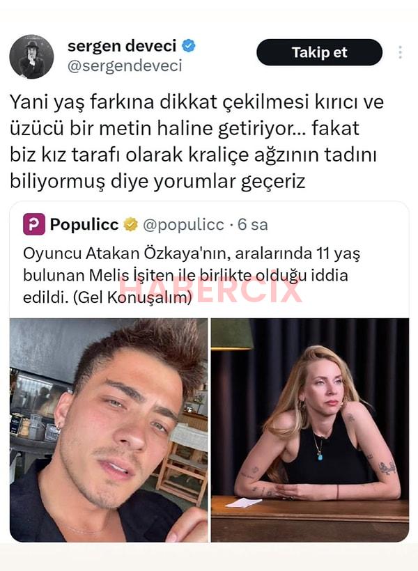 Melis İşiten’le bir dönem aşk yaşayan sonra da yakın arkadaş kalmayı başarabilen Sergen Deveci, Melis İşiten ve Atakan Özkaya’nın aşk yaşadığının iddia edildiği haberlerde yaş farkına yapılan vurgudan rahatsız oldu.