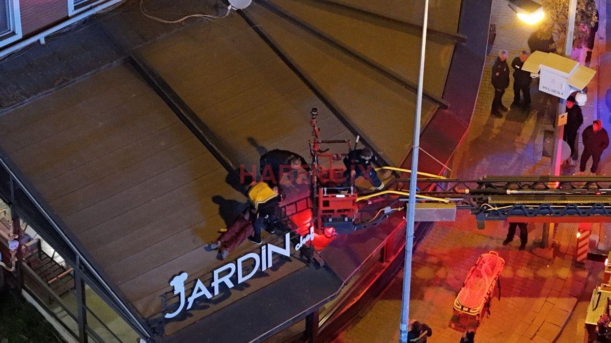 İtfaiyenin merdiven uzattığı kafe üzerine, vazifeli itfaiye erlerince yaralı sedyeye bindirildi.
