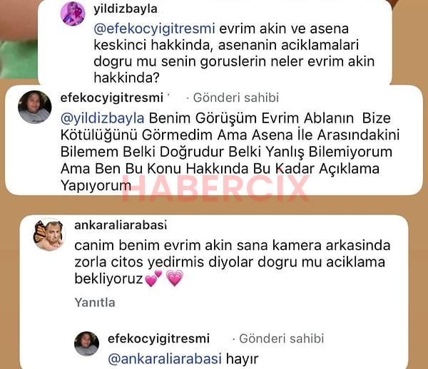 Efe Koçyiğit, soruları içtenlikle yanıtladı ve kendisinin bir problem yaşamadığını söyledi. Asena Keskinci ile yaşananlar hakkında ise bir fikri olmadığını ekledi.