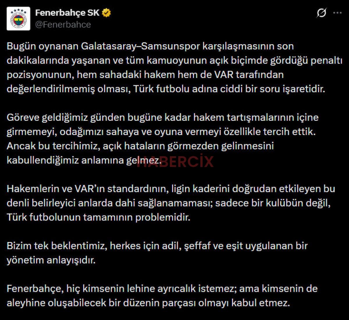Fenerbahçe’den Galatasaray – Samsunspor maçı sonrası tepki!