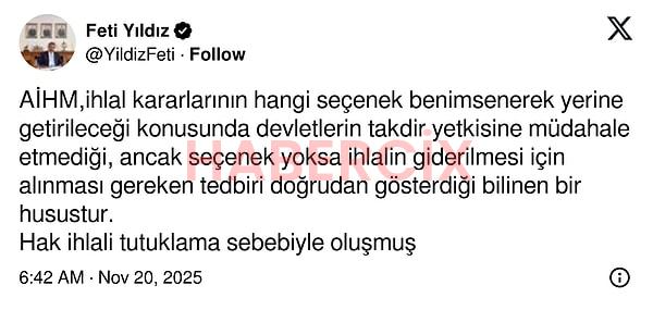 Feti Yıldız paylaşımında, “Hak ihlali tutuklama sebebiyle oluşmuş ise ancak tutuklu kişi tahliye edilerek ihlale son verilebilir.” ifadelerini kullandı. Yıldız ayrıca, “Tutuklunun AİHM kararı doğrultusunda ihlalin kaldırılmasına yönelik verdiği dilekçelerin makul süre içerisinde incelenerek karar kurulması gerekir. Buradaki makul süre keyfi süre değildir.” dedi.