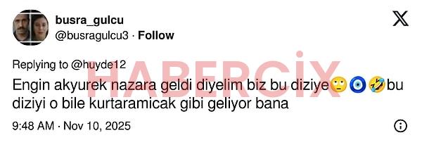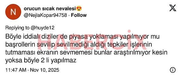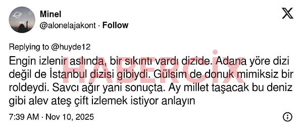Ancak dizi başlayınca aynı etki devam etmedi. Henüz final ihtimalini konuşmak için erken. Ancak dizi reyting sonuçlarında Total’de 2,36 ile 9. sırada, AB’de 1,87 ile 13. sırada, ABC1’de de 2,32 ile 8. sırada yer aldı.