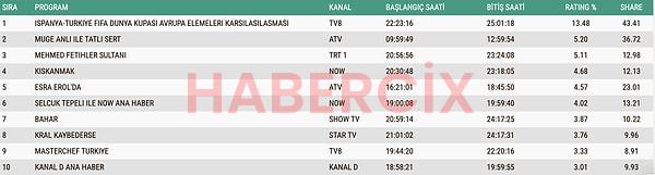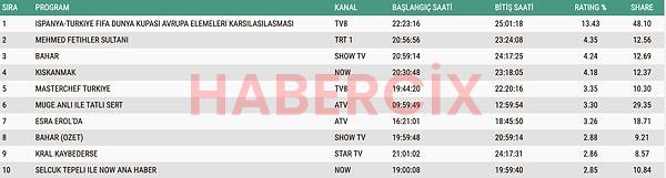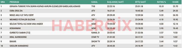 Kral Kaybederse, Gözleri Karadeniz, Bahar, Mehmed Fetihler Sultanı, Kıskanmak dizilerinin yayınlandığı salı gününe İspanya-Türkiye maçı damga vurdu. Ancak özellikle Total sonuçlara bakıldığında dizilerin yalnızca milli maçtan etkilenmediği görülüyor. Esra Erol’da ve Müge Anlı ile Tatlı Sert’in damga vurduğu günde bir dizi 27. sırada yer alıyor!