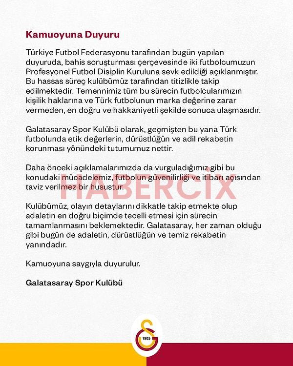 Galatasaray’dan yapılan açıklamada, olayın takip edildiğini belirtildi ve tüm sürecin futbolcuların haklarına ve Türk futbolunun marka değerine zarar vermeden, en doğru ve hakkaniyetli şekilde sonuca ulaşmasını bekledileri duyuruldu.
